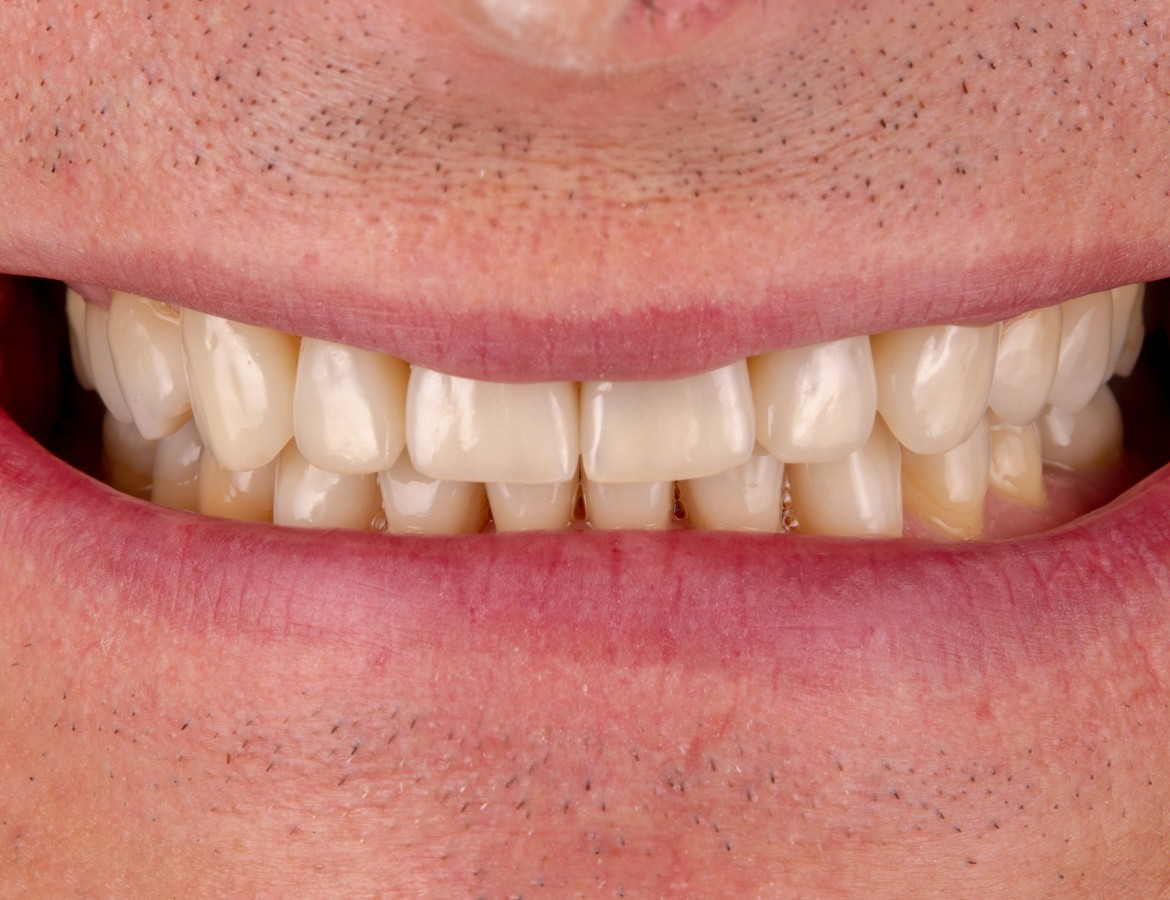 Pan Marek má poškozené zuby díky dlouhodobému skřípání zubů (bruxismu). Jediná možná náprava, je obnovení zubů, každý zub se musí znovu dostavět. V tomto případě jsme volili kombinaci keramických korunek a zubních implantátů. Před samotnou protetickou léčbou, musel pan Marek absolvovat ortodontickou léčbu (léčbu rovnátky). Společně s protetickou léčbou zubů, je zapotřebí eliminovat působení kyselin a pokusit se omezit skřípání zubů, k tomu pomohou noční a sportovní dlahy k ochraně zubů.